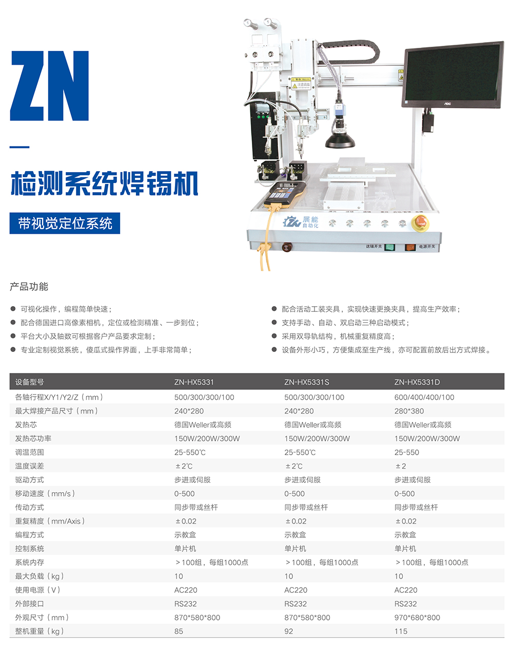 產(chǎn)品包括自動焊錫機(多軸桌面式焊錫機,CCD視覺白動焊錫機,機械手自動焊錫機以及非標自動焊錫機等),自動鎖螺絲機(吸附式鎖螺絲機,吹氣式鎖螺絲機,多軸自動鎖螺絲機,自動鎖螺母機等),點膠機系列設備(桌面式點膠機,CCD視覺點膠機,高速噴射點膠機,在線式點膠機等)。